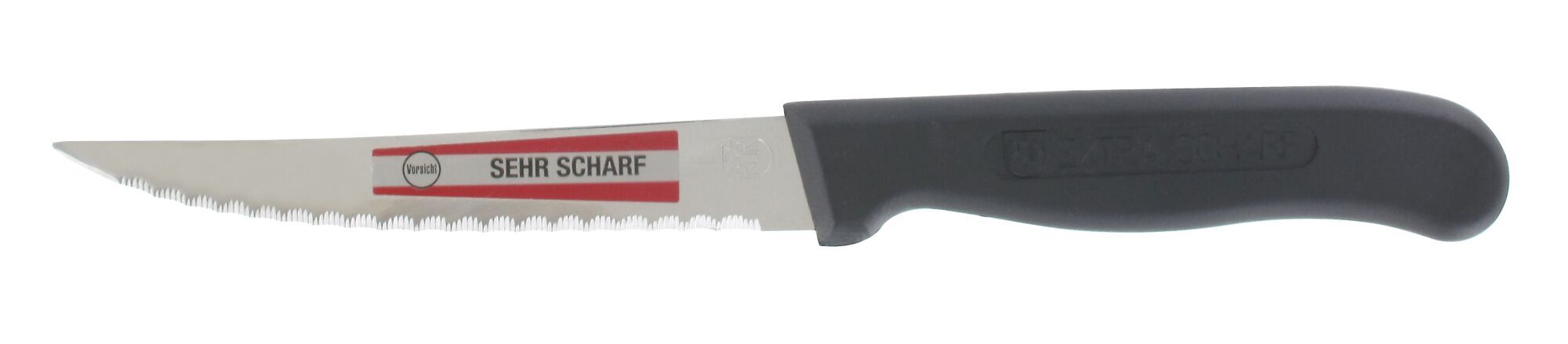 This premium steak knife delivers ultimate cutting comfort with its razor-sharp 110 mm stainless steel blade. The elegant black handle provides a comfortable grip while adding a stylish touch to any dining table. Combining precision, ease of use and design, it is perfect for both everyday meals and special occasions.